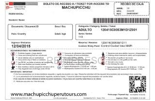 Le billet Machu Picchu est probablement l'un des billets les plus recherchés au monde. Il existe en 4 versions qui offrent, d'une expérience culturelle étonnante dans le musée de Machu Picchu, à une aventure vertigineuse dans la montagne Huayna Picchu. Il y a 5 000 billets disponibles, divisés en 2 groupes, matin et après-midi, ceux-ci peuvent être réservés jusqu'à 2 semaines à l'avance. Cependant, si vous voulez monter les montagnes du Machu Picchu, vous devez savoir que les billets sont très limités, et ont une telle demande, qu'un billet pour la montagne Huayna Picchu doit être réservé 3 mois plus tôt.